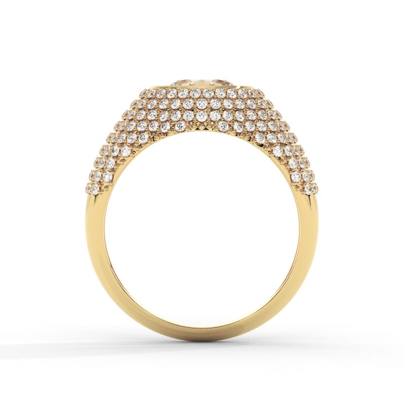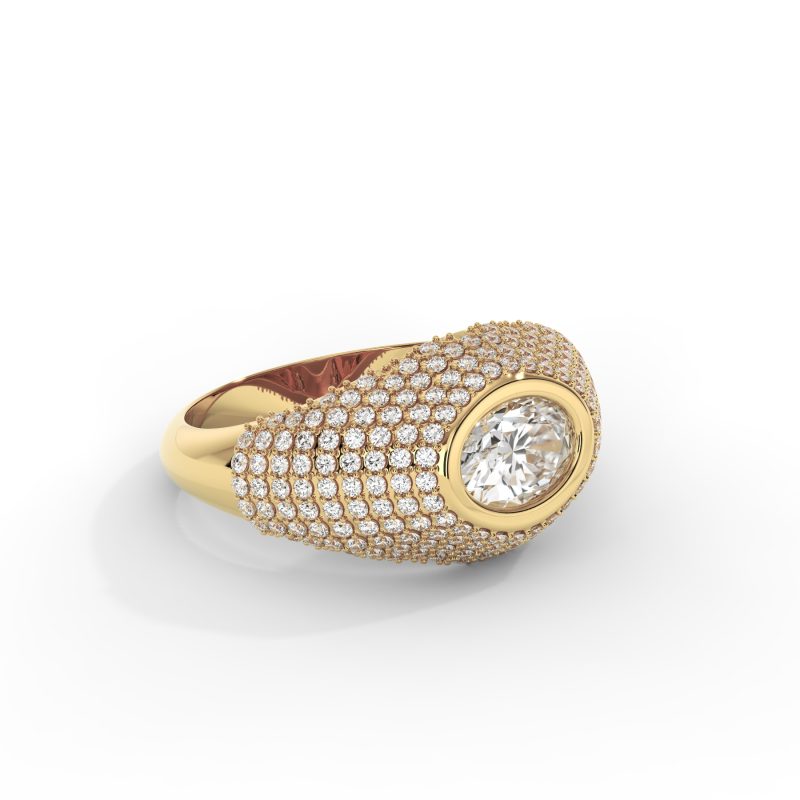 טבעת יוקרתית המציגה יהלום מעבדה אובל במשקל 0.70 קראט בניקיון VS וצבע F, מוקף בשיבוץ פאווה מרהיב של יהלומי צד במשקל כולל של 0.50 קראט. העיצוב המיוחד בזהב 14K יוצר מראה מלכותי עם נצנוץ יוצא דופן המתפרש על פני כל הטבעת.