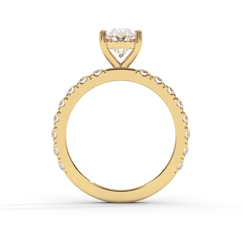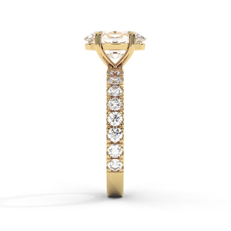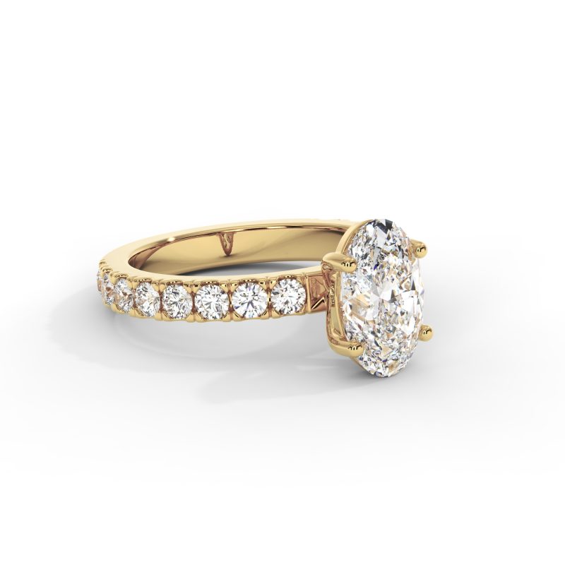 טבעת אירוסין מרהיבה המשובצת ביהלום מעבדה אובלי במשקל 2.00 קראט בניקיון VS1 וצבע F. החישוק המשובץ ביהלומי צד במשקל 0.50 קראט באיכות VVS וצבע D-F מדגיש את יופיו של היהלום המרכזי. שיבוץ היהלומים העדין בזהב 14K יוצר טבעת אירוסין יוקרתית ונצחית.