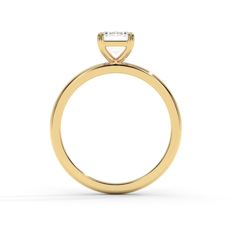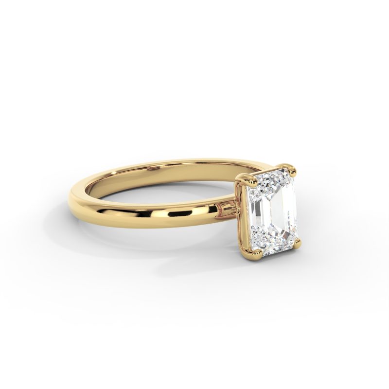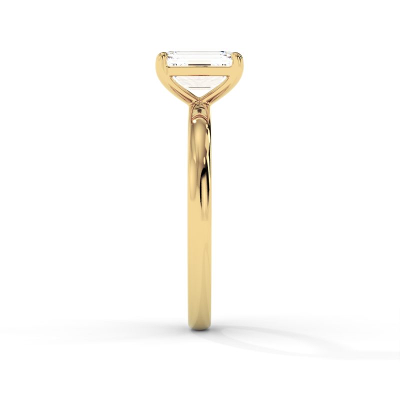 טבעת אירוסין סוליטר מינימליסטית המשובצת ביהלום מעבדה בחיתוך אמרלד במשקל 1.00 קראט בניקיון VS וצבע D-F. העיצוב הנקי והחישוק החלק בזהב 14K מדגישים את המדרגות המרשימות של היהלום המרכזי ויוצרים מראה וינטג' ואלגנטי.