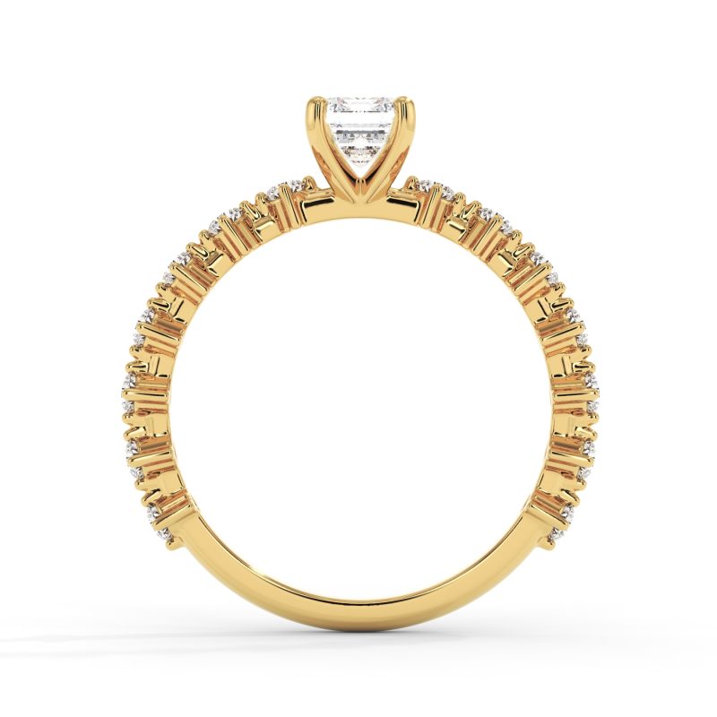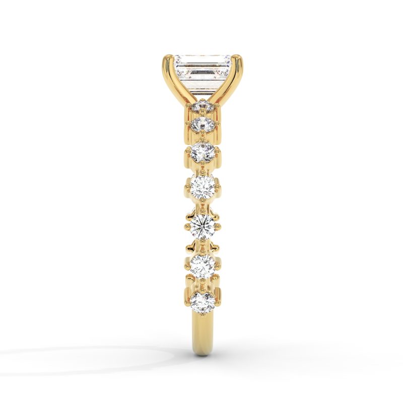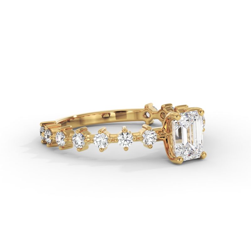 טבעת אירוסין מרשימה בעיצוב ייחודי, במרכזה יהלום מעבדה בחיתוך אמרלד במשקל 1.00 קראט. הטבעת משובצת ב-14 יהלומי מעבדה עגולים נוצצים בצדדים במשקל כולל של 0.20 קראט. כל היהלומים באיכות גבוהה בניקיון VS וצבע D-F. עיצוב השיבוץ בזהב 14K מדגיש את היהלום המרכזי ויוצר מראה מלכותי ונוצץ.