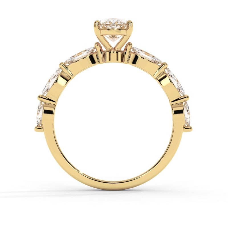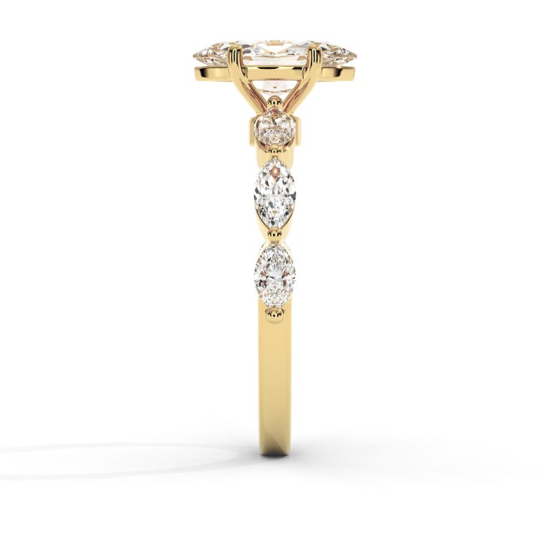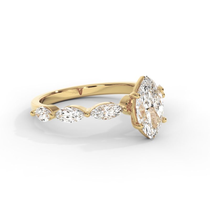 טבעת אירוסין עדינה המשובצת ביהלום מעבדה בחיתוך מרקיזה במשקל 1.00 קראט בניקיון VS וצבע F. חישוק הטבעת מעוטר ביהלומי מרקיזה בצדדים במשקל כולל של 0.60 קראט באיכות VS וצבע D-F. העיצוב הייחודי בזהב 14K יוצר מראה אלגנטי ורומנטי.