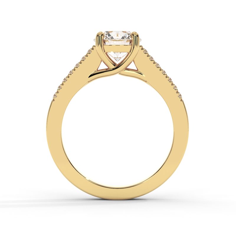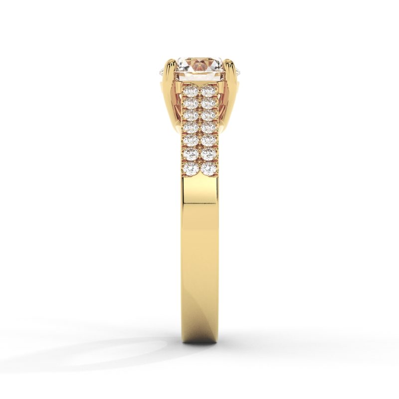 טבעת אירוסין מרהיבה המשובצת ביהלום מעבדה מרכזי במשקל 1.00 קראט בניקיון VS וצבע F. החישוק המעוצב בשתי שורות של יהלומים במשקל כולל של 0.40 קראט מדגיש את היהלום המרכזי. העיצוב המדורג בזהב 14K יוצר מראה מלכותי ועשיר.