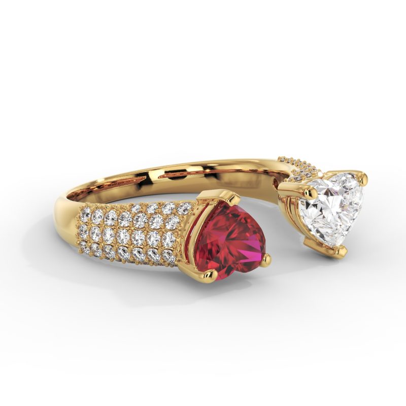 טבעת רומנטית ייחודית המשלבת שני לבבות: יהלום מעבדה בחיתוך לב במשקל 0.80 קראט ורובי סינטטי תואם במשקל 0.80 קראט. הטבעת מעוטרת ב-70 יהלומי מעבדה קטנים במשקל כולל של 0.70 קראט, כולם בניקיון VS וצבע D-F. עיצוב הזהב 14K יוצר מראה זורם ומתוחכם, כשהלבבות נפגשים במרכז הטבעת.