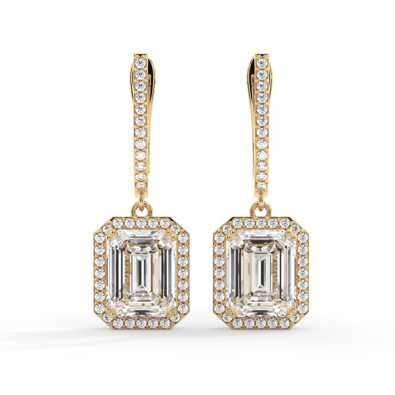 עגילי היילו מפוארים המשובצים בשני יהלומי מעבדה בחיתוך אמרלד, כל אחד במשקל 0.50 קראט בניקיון VS1 וצבע F. מסגרת היהלומים העגולים במשקל 0.40 קראט בכל עגיל מדגישה את יופיו של היהלום המרכזי. העיצוב בזהב 14K כולל שיבוץ יהלומים לאורך התליה היוצר מראה מלכותי ונוצץ.