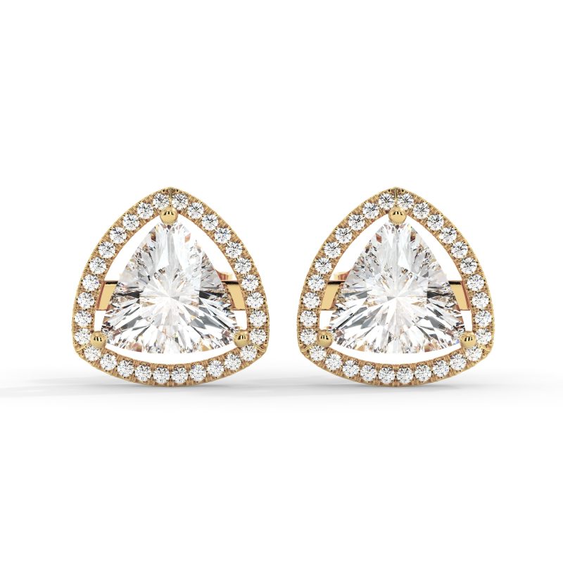 עגילי היילו מרהיבים המשובצים בשני יהלומי מעבדה בחיתוך משולש, כל אחד במשקל 1.00 קראט בניקיון VS1 וצבע F. מסגרת היהלומים העגולים במשקל 0.30 קראט בכל עגיל מדגישה את המבנה הגיאומטרי הייחודי. העיצוב המודרני בזהב 14K יוצר מראה נועז ומתוחכם.