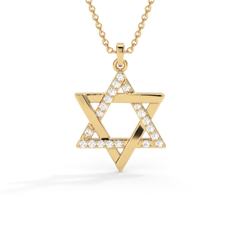 שרשרת מגן דוד זוהרת ומרשימה, המשובצת ביהלומי מעבדה נוצצים במשקל כולל של 0.25 קראט. היהלומים, באיכות VVS וצבע D-F, משובצים בקפידה לאורך קווי המתאר של סמל המגן דוד, ומעניקים לתכשיט ברק עוצר נשימה ומשמעות היסטורית עמוקה. התליון עשוי זהב 14 קראט מלוטש ומחובר לשרשרת זהב עדינה באורך סטנדרטי של 42 ס"מ, המשתלבת באופן אלגנטי סביב הצוואר. זוהי דרך יוקרתית ואישית לשאת את הזהות והמורשת, ומהווה מתנה מושלמת בעלת ערך סנטימנטלי גבוה.